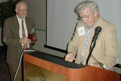 John Klasner (Western Illinois University - retired) waiting expectantly for Gene LaBerge (University of Wisconsin - Oshkosh retired) to present him with the 2001 Goldich Medal .