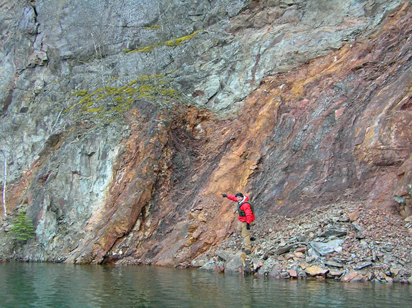 The lovely George Hudak pointing out contact between Neoarchean iron-formation and a metagabbroic dike (green). (photo courtesy Mark Jirsa) |
